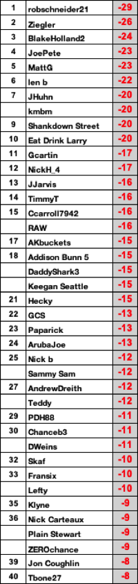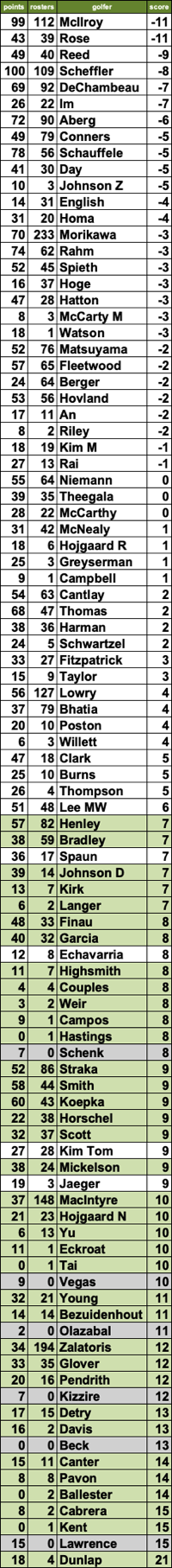 89 of 95 golfers in field were selected to at least one roster. Lawrence at 15 points was the highest valued SNUB, all the others were <10 points. 4 of 5 amateurs were picked at least once, with only Beck left out. All things considered, Johnson D was perhaps the most disrespected. Posted at a sucker-pick number of 39 points, only 14 entrants took the bait. All 6 SNUBS missed the cut.