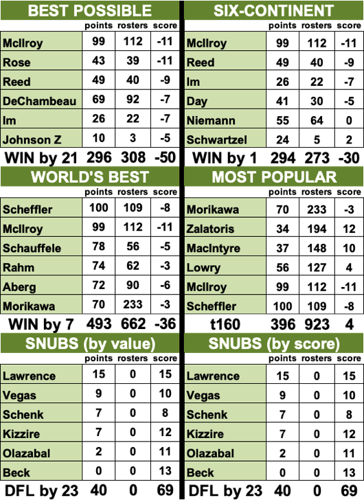Rory was part of four teams listed below. The Best Possible roster (within budget) would have finished -50, 21 shots better than our winning score. It was a good tournament for the Big Guns, as the six highest valued golfers would have posted a winning score of -36 (if allowed an unlimited budget). We made a couple mistakes with the Most Popular picks, though and that over-budget team would not have even been Top 100. The 6-Continent team would have squeaked out a narrow one-shot win, and under budget. There were only 6 SNUBS total, so whether sorted by value or score it's the same team and none of them made the weekend and would have finished DFL by a long shot.