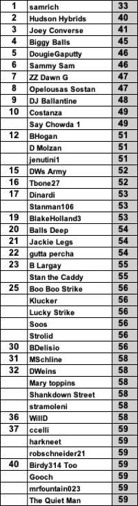 22 entrants advanced their entire roster to the weekend, 13 of whom finished on the leaderboard, including the Top 3. Bonzo (DFL) and GriffySnacks (2nd to last) had the weekend off.